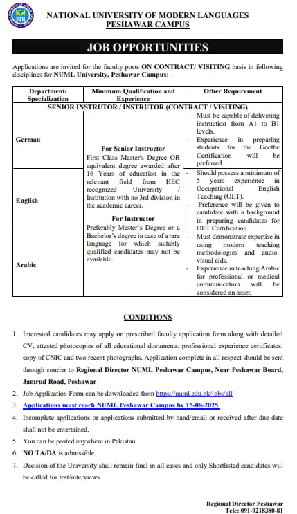 NUML Job Advertisement Peshawar 2025: